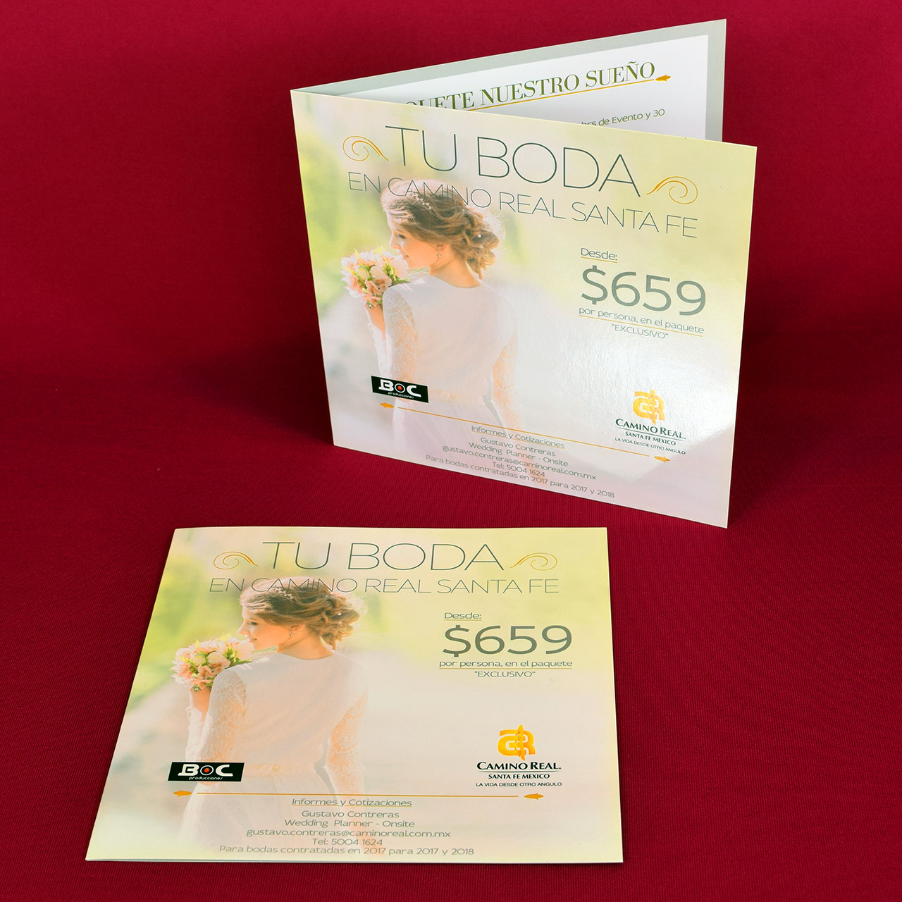 Díptico Tu Boda - Camino Real Santa Fe en medidas 15x15cm. impreso sobre cartulina sulfatada de dos caras de 12pts. a todo color, recubierto con barniz UV brillante en ambas caras y pleca de doblez.
