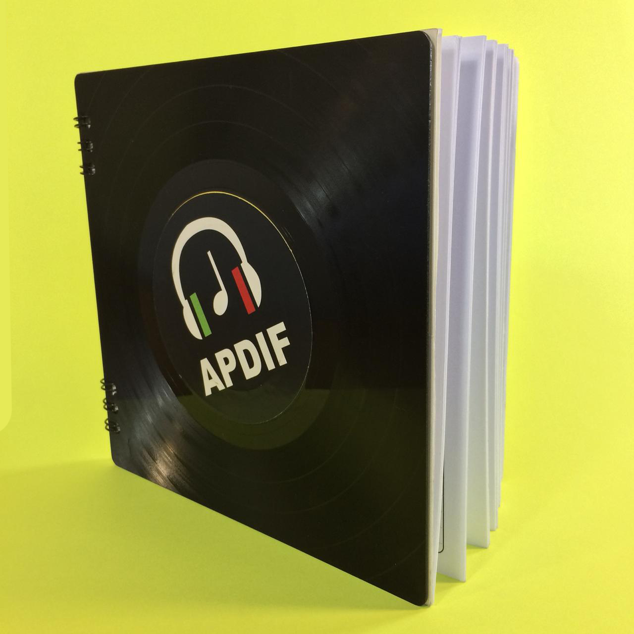 Libreta APDIF con pastas duras compuestas por discos de acetato, cortados a medida, interiores impresos frente y vuelta a una tinta, sobre papel bond de 90 gr. armado con espiral.